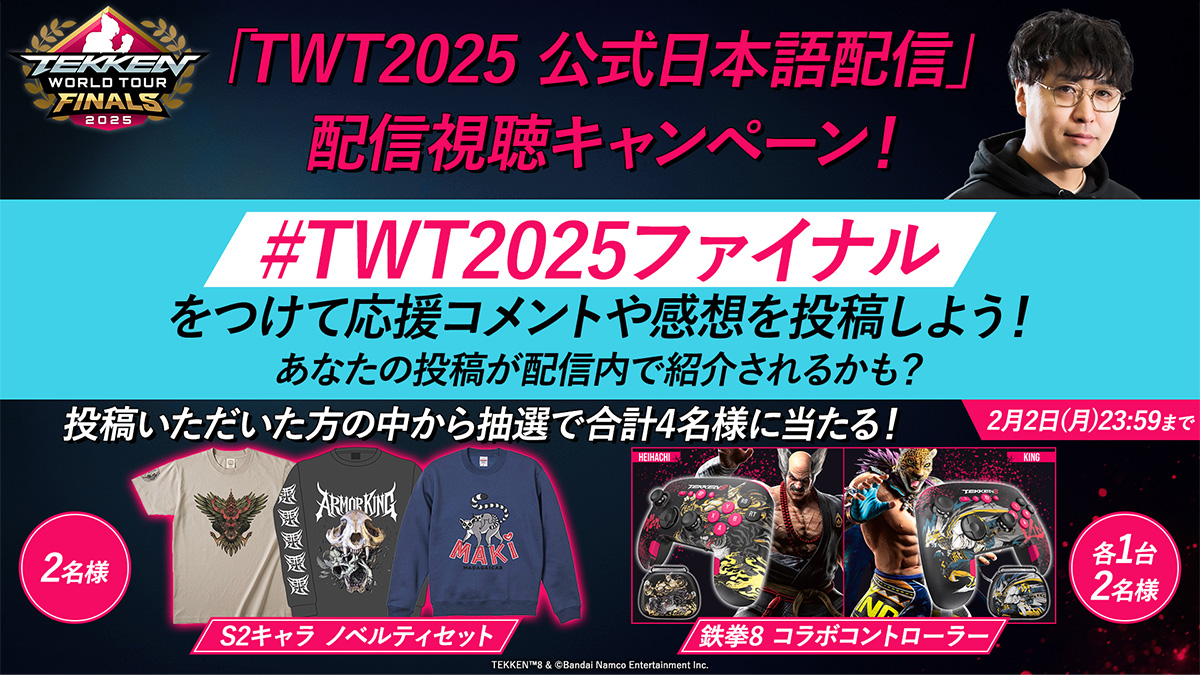 - ・株式会社バンダイナムコエンターテインメント(以下、当社といいます)は、『鉄拳8』以下、本サービスといいます)に関連して「TWT2025 Global Finals公式日本語配信 配信視聴キャンペーン」を実施いたします。
