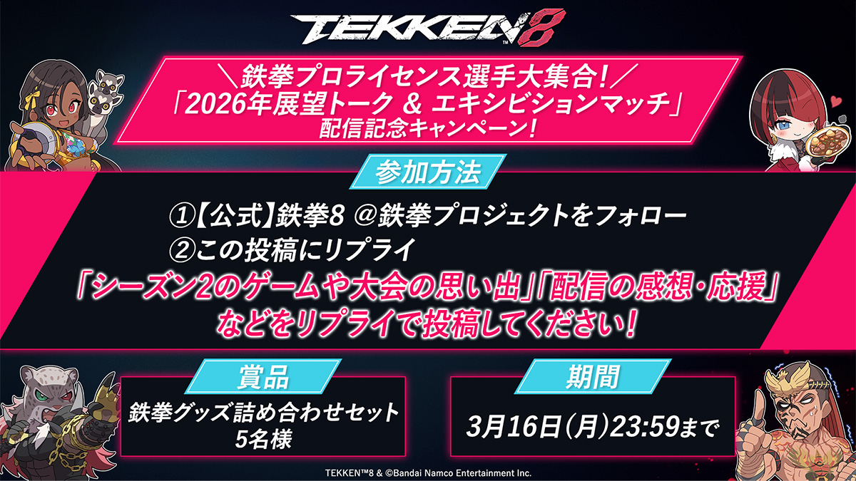 - ・株式会社バンダイナムコエンターテインメント(以下、当社といいます)は、『鉄拳8』(以下、本サービスといいます)に関連して『「鉄拳プロライセンス選手大集合!2026年展望トーク&エキシビションマッチ」配信記念キャンペーン』以下、本キャンペーンといいます)を実施いたします。